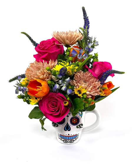 This season we are offering designs of brightly colored flowers in calavera mugs! These colorful sugar skull containers and complementing floral arrangements are perfect for celebrating.