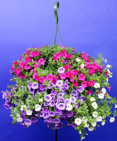 Our calibrachoa mixed hanging basket is beautiful. Fine for a sunny location, this hanging basket will bloom all summer with proper care. The colors available in our greenhouse today may vary from the colors pictured here. Don't worry, they will be beautiful!