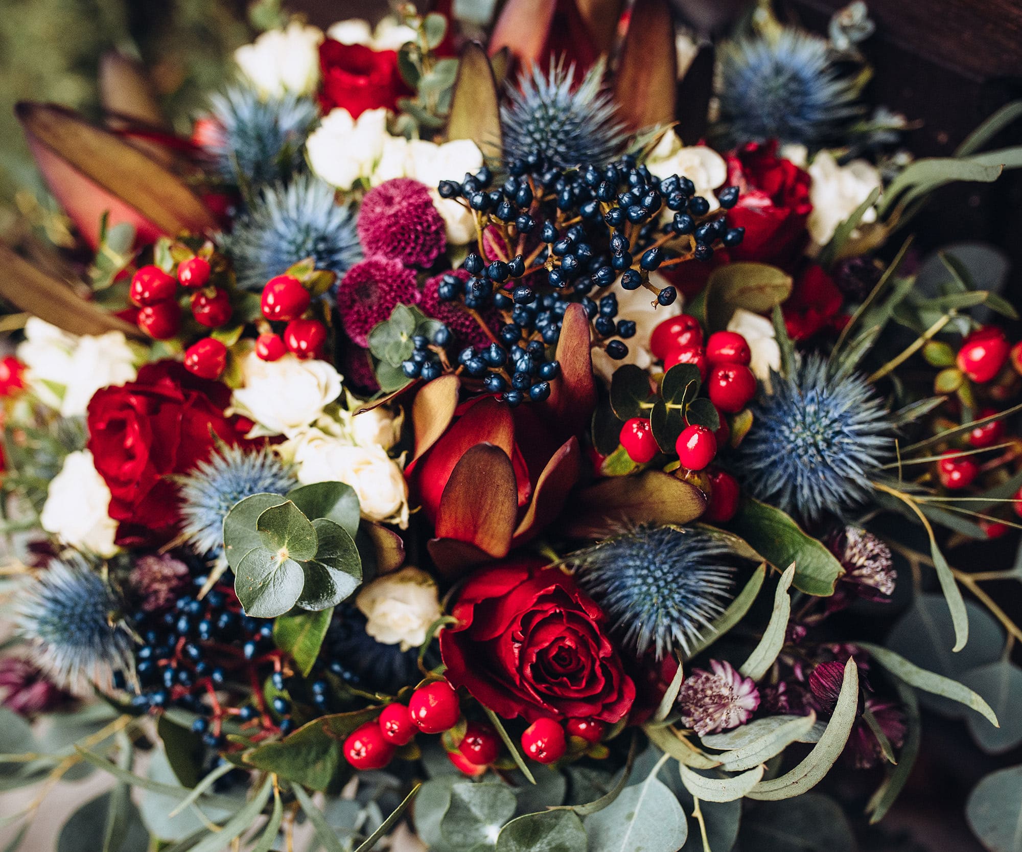 The winter months wrap us in a palette of whites, reds, greens, blues, and dazzling metallics. It's a combination that feels timeless and full of wonder. Crisp white blooms like anemones, orchids, and poinsettias echo the stillness and purity of snow-covered mornings, as well as the tranquility we're eager to find this time of year. Cool blues add a layer of peace and calm, creating spaces that feel like a retreat from the holiday hustle and bustle. Red, the ultimate color of winter warmth, is found in bold roses, dramatic amaryllis, and classic poinsettias. Whether crimson, ruby, or cherry, red brings feelings of passion, energy, and excitement to our lives.