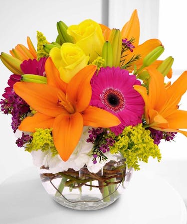 Bright bubble bowl featuring roses, gerbera daisies, lilies and hydrangea - a true summer daze...for any day of the year.